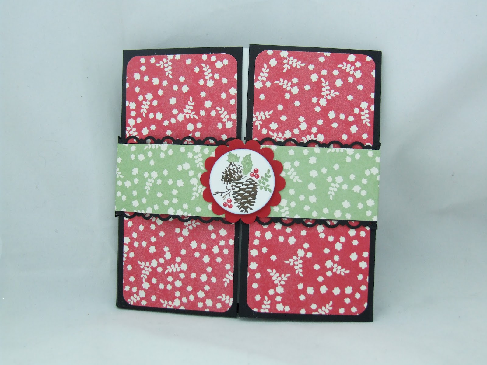 Today is my first contribution to Christmas Club. Yes hard to believe I'm thinking about Christmas but like many of you I was way behind on card making when I hit Christmas 2011 and I happened to comment on Sylvie's blog that she is really organised making Chrimbo cards already. She came back to me and said that the ladies in the club had started their club for that very reason, they weren't organised!!!!! They invited me to join and now each fortnight one of the club suggests the challenge and everyone makes a Christmas themed card using that challenge. In my opinion I chose a tough one to start on as it had to be a card with more than the usual one fold line. The challenge also stated that it couldn't be an easel card so I set too hunting about my craft room and remembered an interesting card made at craft club. It was set then by the lovely Jenny and it reminded me of a lovely lady Kath who also attended our club. Sadly she passed away last year and so this card is for Jenny, thank you for the technique, and for Kath as yesterday our craft club met for a day of crafting and we fondly remembered our friend and how helpful and generous she always was to us all.