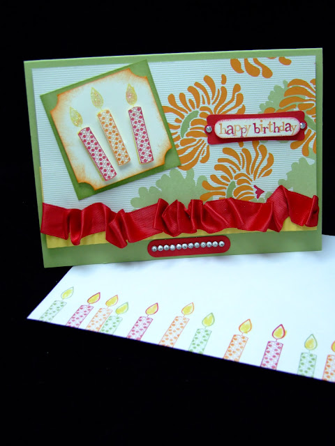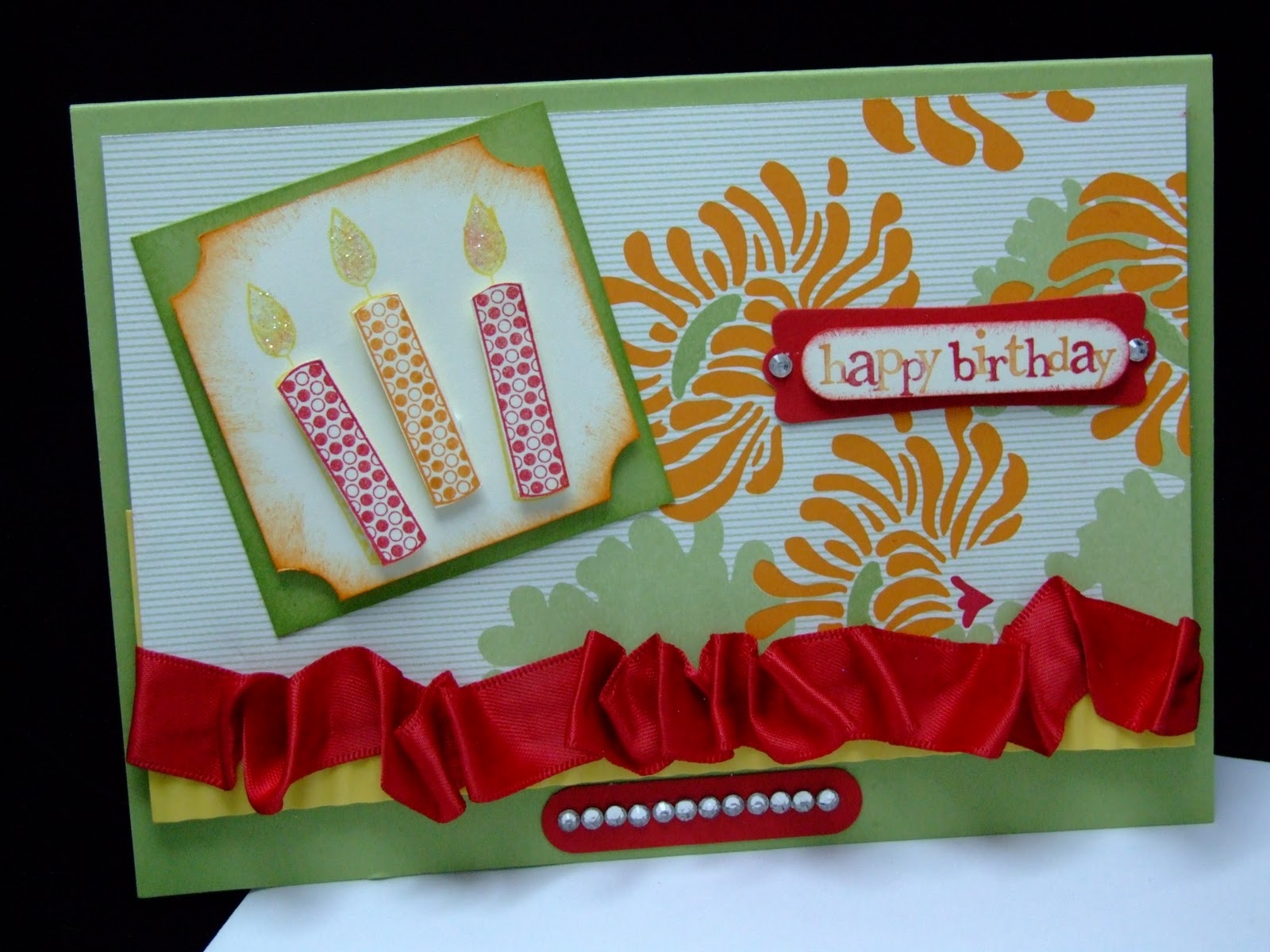 Above is the card I made for Tia which combines the fun stamp set Party This Way which I received as a free gift at convention back in November and the gorgeous greenhouse gala designer series papers. There's a few rhinestones thrown in which 12year olds love and some lovely gathered ribbon in red satin. I used my crimper to add a little subtle texture in the daffodil delight cardstock beneath the ribbon. Wow and what a colour combo this is. Today at the workshop daffodil delight, pumpkin pie and in-colour pear pizzass went down a storm and everyone agreed what a fab combo for the coming spring and to brighten these gloomy days.