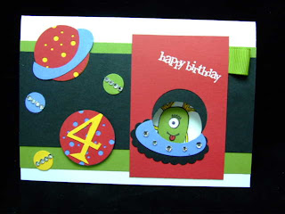 The design incorporates oval and circle punches and the cheeky Make a Monster stamp set from our new Idea Book. I've also used rhinestones to add some cosmic energy to his space ship and doesn't it look great. Inside you can see the monster with his birthday balloon from another new set Party this Way.