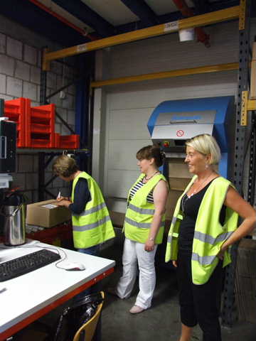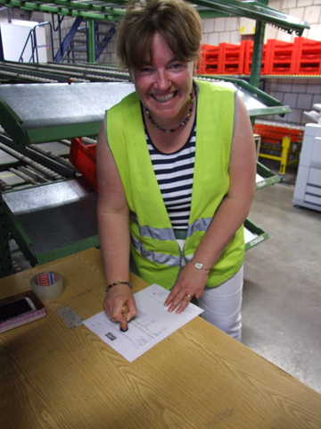 Compared to the other two lovely ladies it most certainly does I know!!!!! This is us pushing the shopping cart or picking trolley around the picking zone.  You can see a computer with a green arrow. This identifies the fact that we have reached the right point to the centimetre for a red light (top right of picture) to shine on the box that you need to pick an item from.  The trolley takes 9 orders in the red trays that you can see.   One person usually pushes the cart and collects all 9 orders simultaneously.  We picked 31 items in total and took at least 30mins the usual efficient staff collect 400 items per hour!  I think their jobs are safe from us.